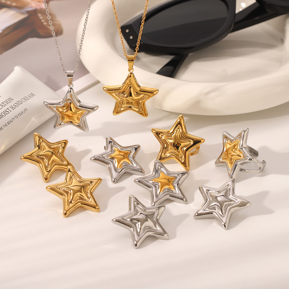 Cross-border new five-pointed star titanium steel jewelry 18K gold and silver color matching star stainless steel necklace earrings ring jewelry
