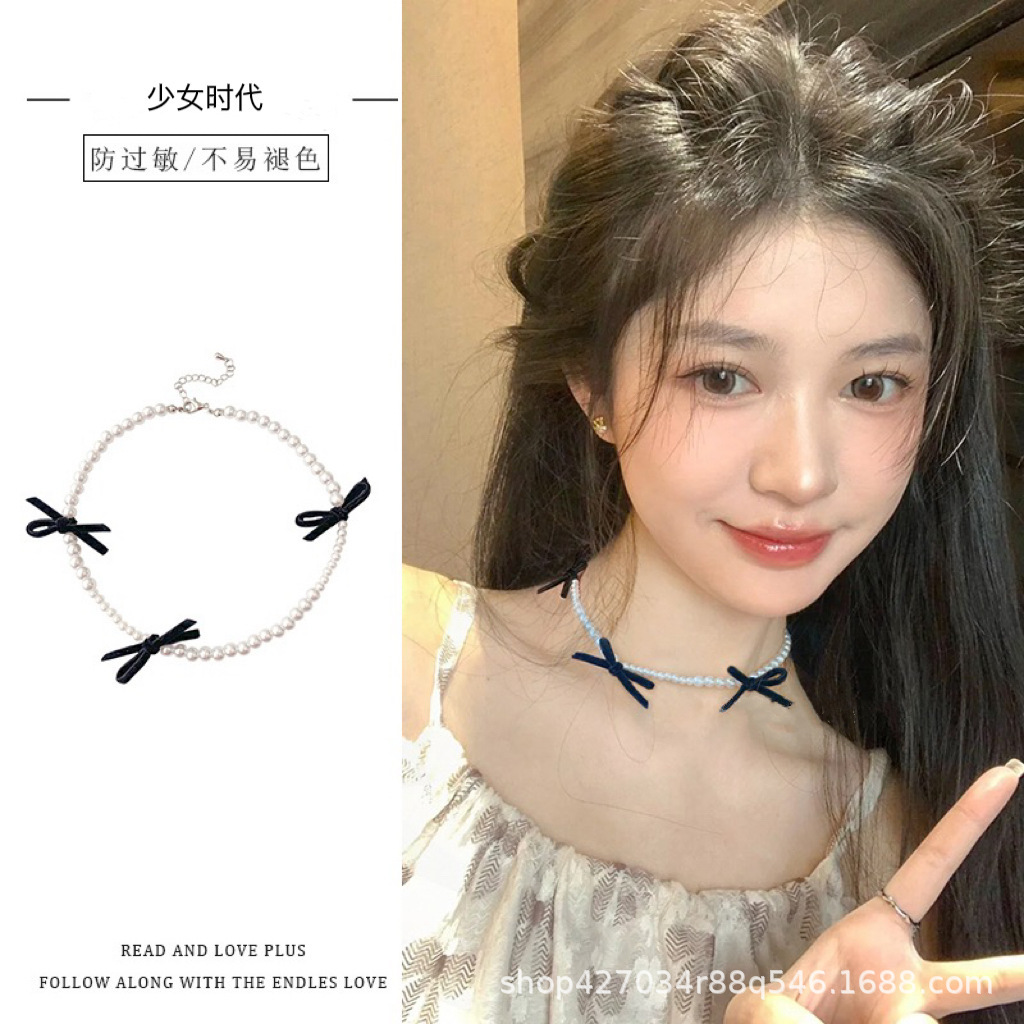 Factory Wholesale Fashion Velvet Bow Ribbon Imitation Pearl Necklace Women's Japanese and Korean Simple All-match Women's Neck Jewelry