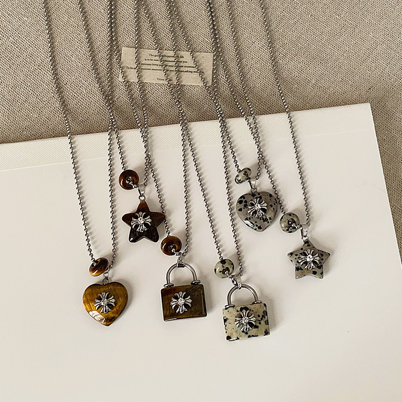 Natural Stone Lock Heart Pendant Titanium Steel Necklace for Women Simple Trendy Fashion Versatile Choker Collarbone Chain