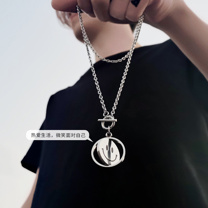 ins Style Korean Style Smiley Pendant Titanium Steel Necklace Pendant for Men and Women Woolen Chain Crying Face Smiley Simple All-match Style