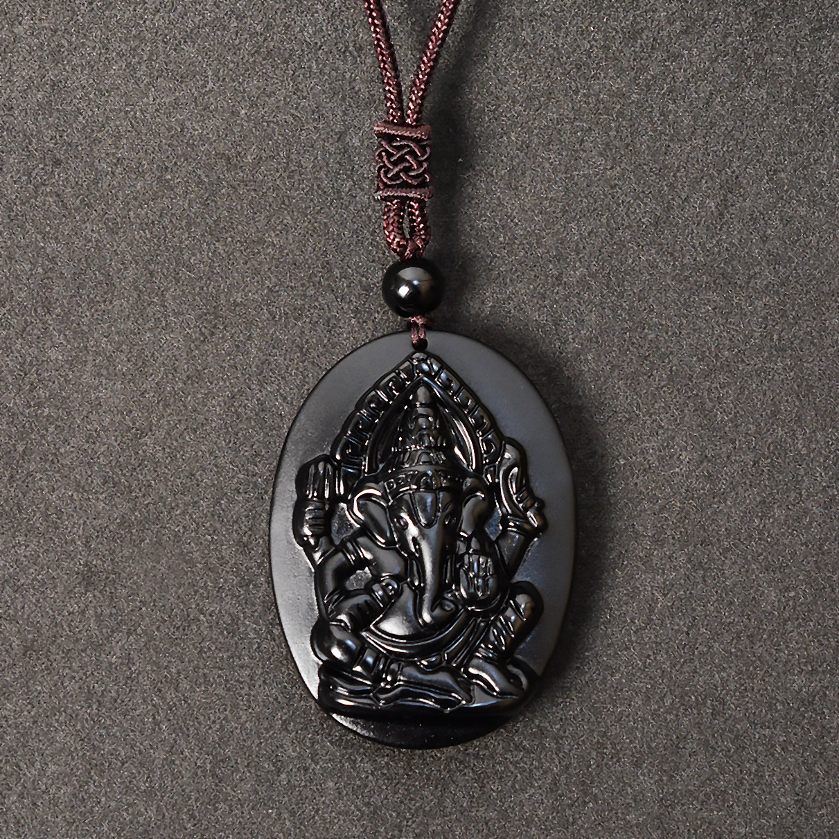 Cross-Border Natural Obsidian Four-Armed Ganesha Thai Ganesha Pendant Necklace Men's and Women's Natural Crystal Matte Pendant