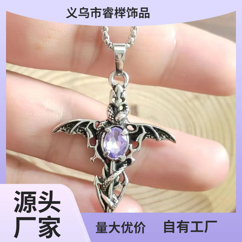 Retro Devil's Sword Pendant Men's Trendy Distinctive Amethyst Chain Fashion Imitation Thai Silver Angel Wings Necklace