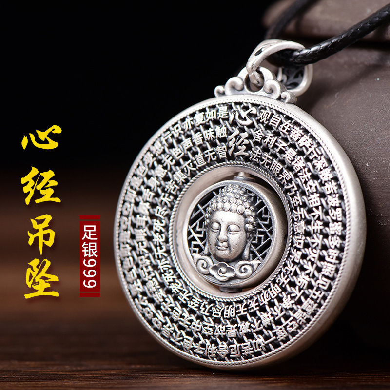 Sterling silver 999 heart sutra pendant pure silver retro hollow personality fashion men's and women's necklace pendant sweater chain