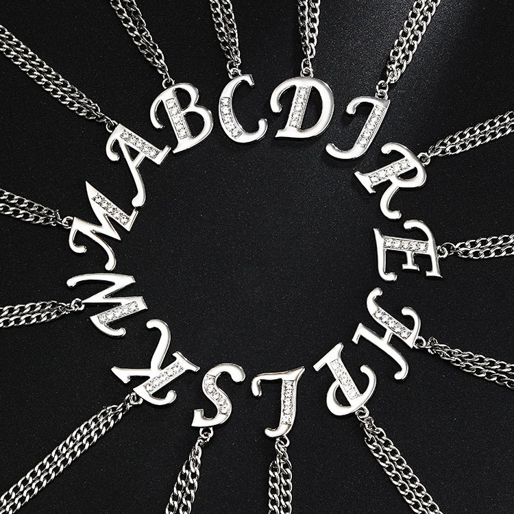 Cross-Border European and American Popular 26 Diamond-Encrusted English Letter Necklace Jewelry Accessories Hip-Hop Men's Stainless Steel Nk Necklace
