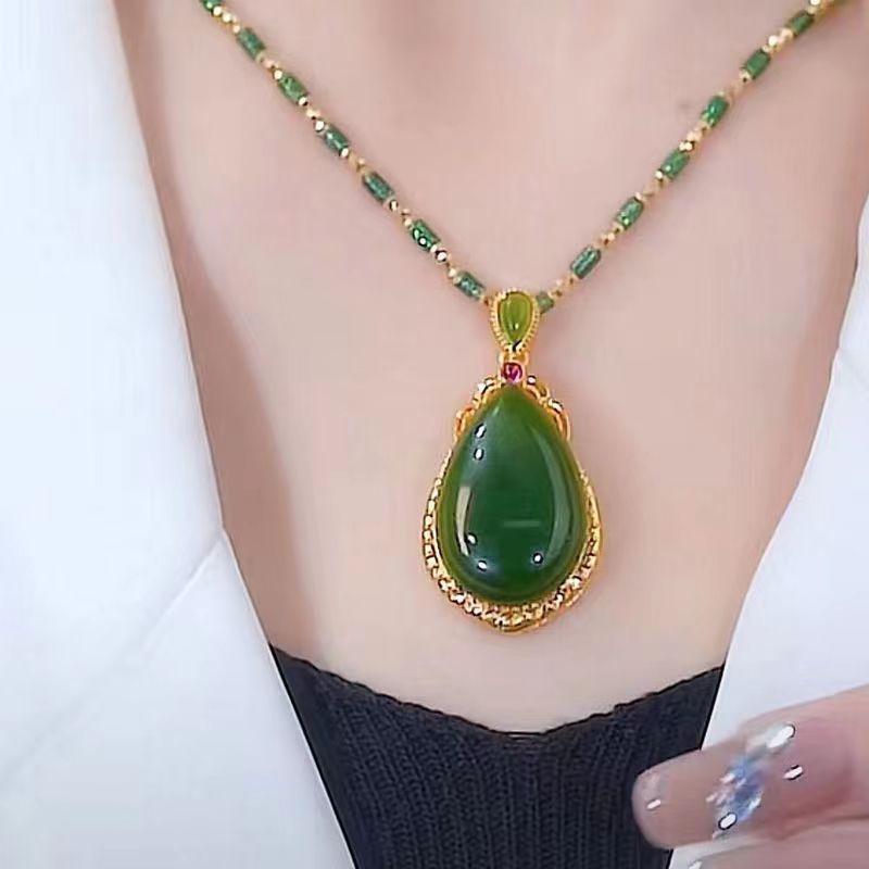 Tiktok popular Jasper water drop pendant gold necklace for women retro fashion elegant simple new online celebrity necklace for women