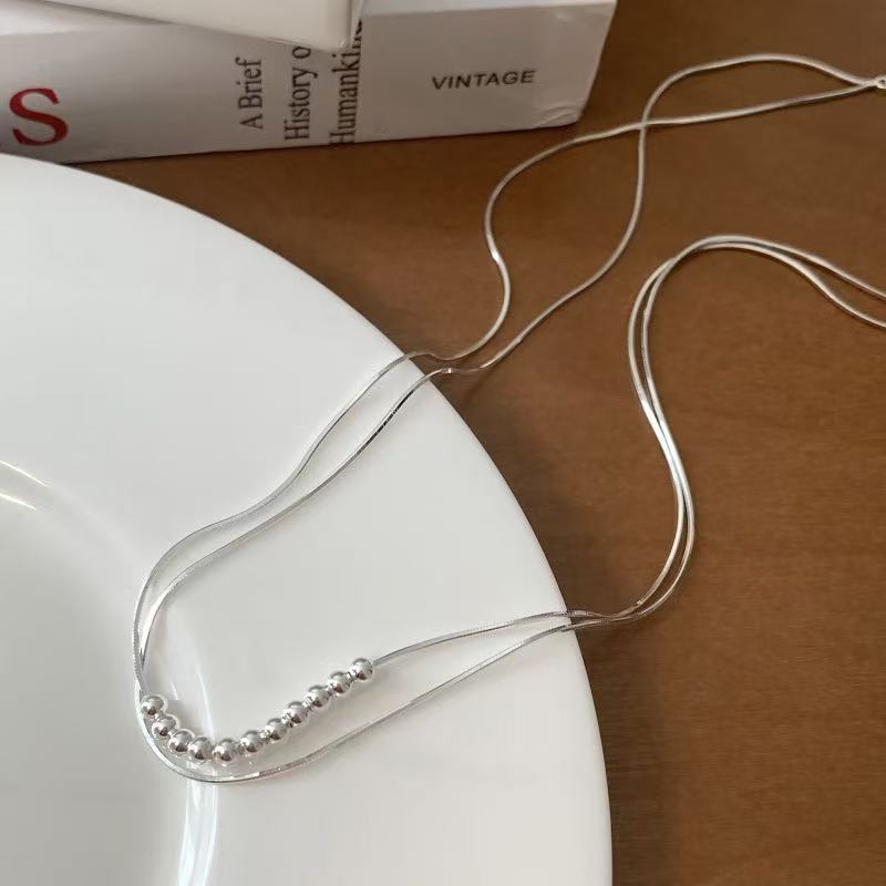 French Exquisite and Simple Double-Layer Silver Bead Necklace for Women, Niche Light Luxury Stacking Versatile Design Clavicle Chain Accessory