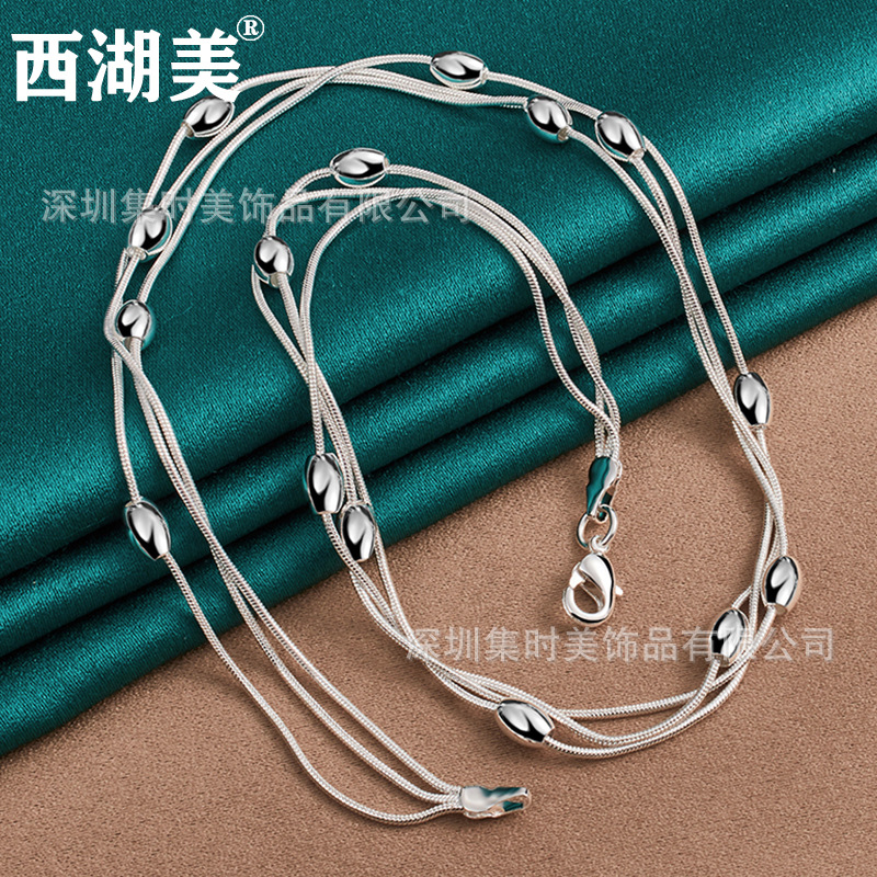 Three-Line Snake Chain String Oval Hollow Ball Necklace Women's Shrimp Buckle Silver Jewelry West Lake Beauty Jewelry