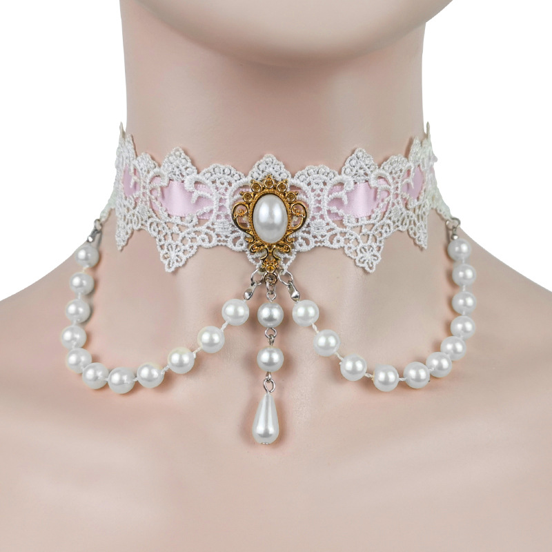 Korean cross-border European and American necklace white pearl lace wear pink ribbon women's necklace tassel necklace pearl collar