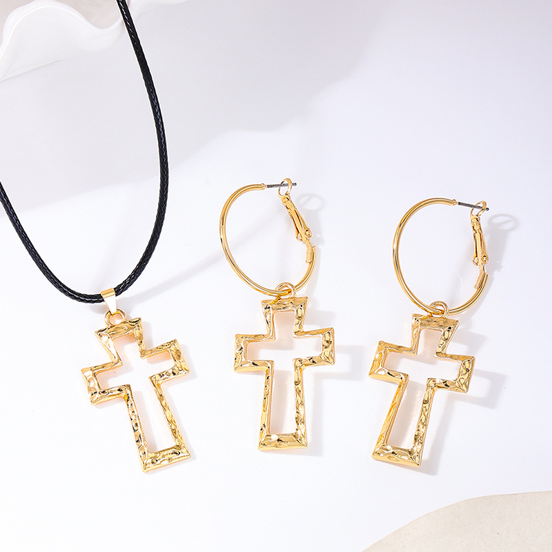 European and American Fashion Temperament Design Sense Metal Hollow Cross Leather Rope Pendant Necklace Women Earrings Earrings Jewelry