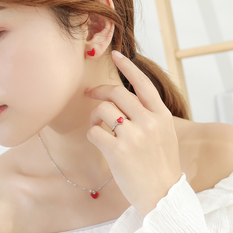 South Korea fashion small red heart necklace women's heart-shaped clavicle chain simple all-Match ring girl's heart stud earrings one-piece delivery