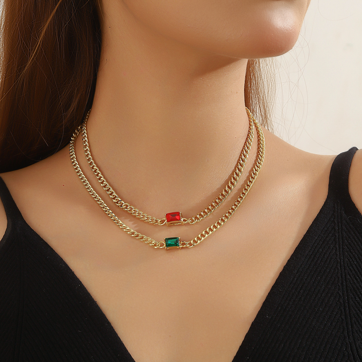 European and American New Fashion Simple Zircon Double Chain Stacking Necklace Women's Colorful Square Zircon Versatile Light Luxury Trendy Jewelry