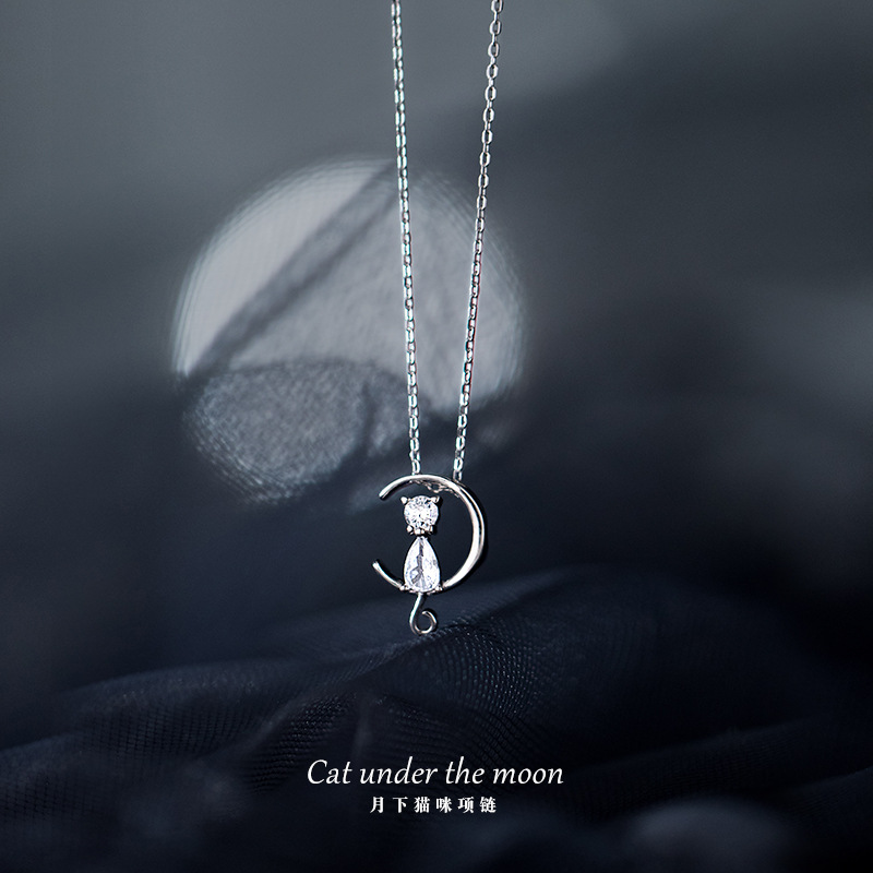 Love Rocky s925 silver girl heart kitten crescent pendant necklace female temperament Korean style compact neck chain D8180