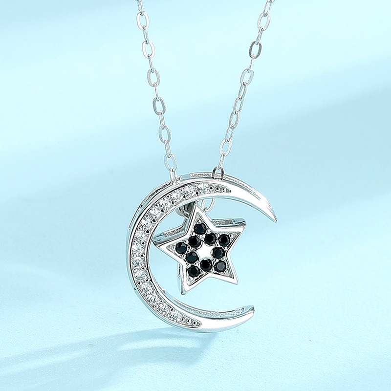 Source Factory S925 Sterling Silver Star and Moon Necklace, Sterling Silver Simple Moon and Five-Star Pendant for Girls, Trendy Jewelry with Personality