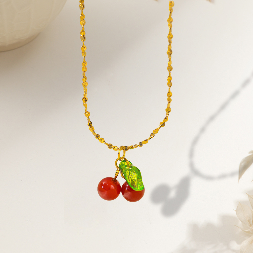 High-End Elegant Girl Sweet Student Cute Gift Carnelian Cherry Fruit Necklace Clavicle Chain Titanium Steel Female