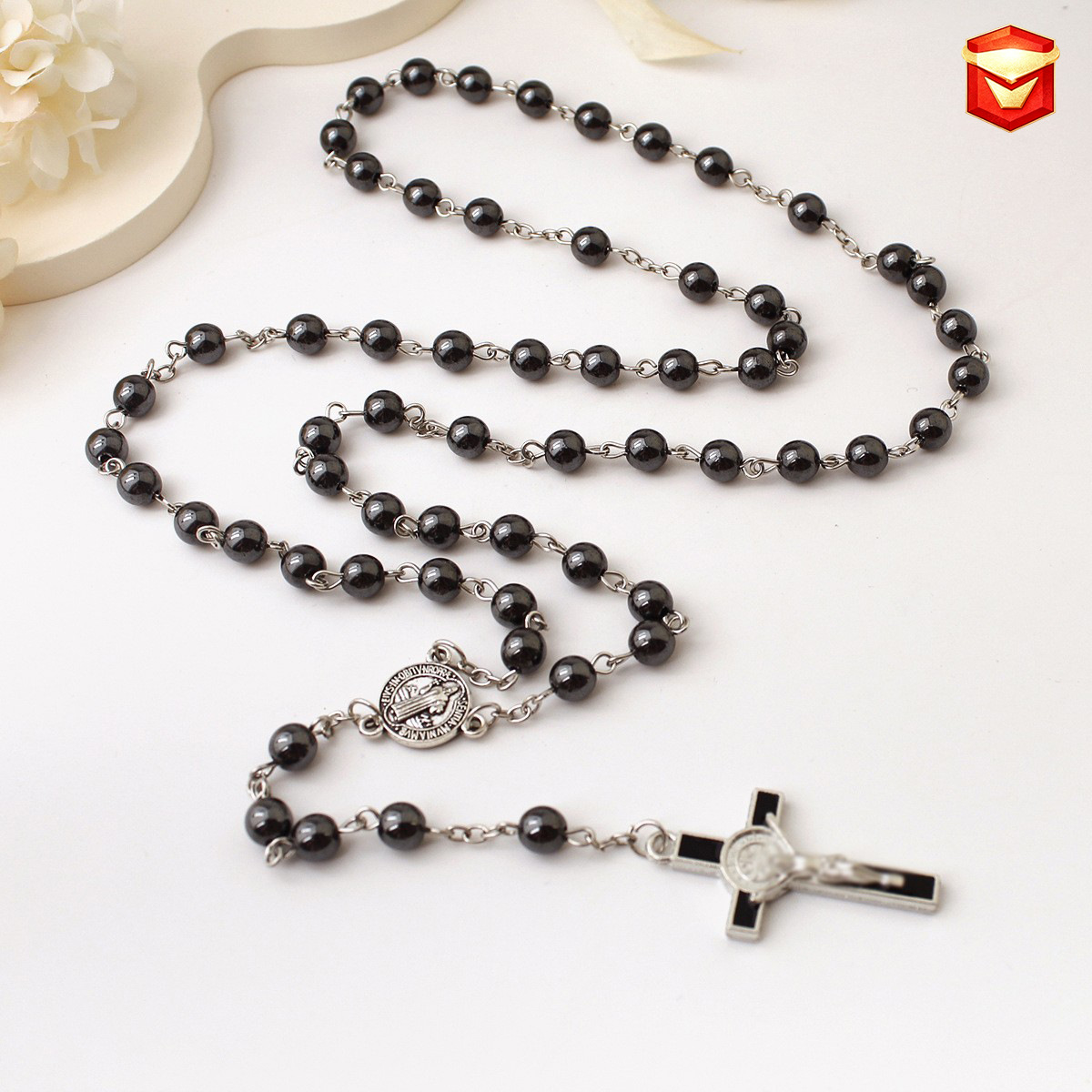 European and American Style Long Rosarynecklace Cross-Border E-Commerce Saint Benedict Retro Black Gallstone Cross Necklace