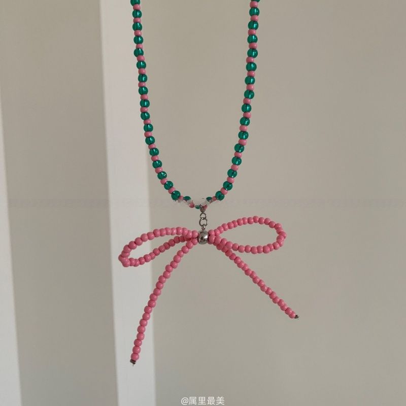 Spring and summer hand-made green pink beaded clavicle chain Pink pink bow necklace girly natural stone sweater chain for women