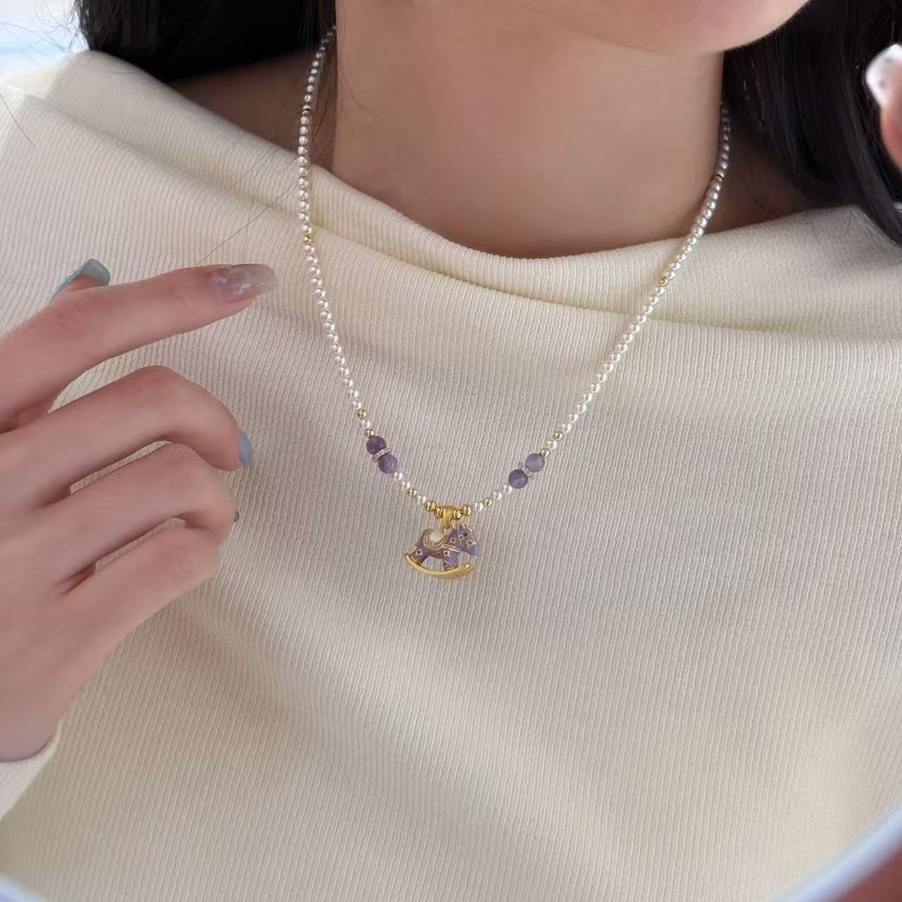 Purple Carousel Pearl Set, Girly Heart Jewelry, Pearl Necklace, Accessible Luxury, Niche Elegant, Versatile Clavicle