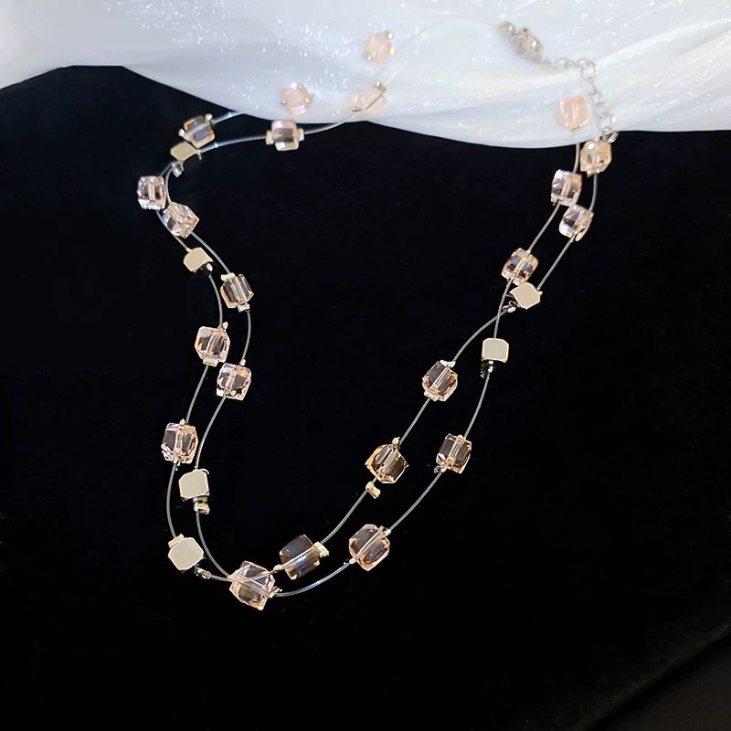 2025 Fantasy Fishing Line Pink Crystal Double-layer Square Beaded Stacked Necklace Girl Spice Girl Super Fairy Clavicle Chain
