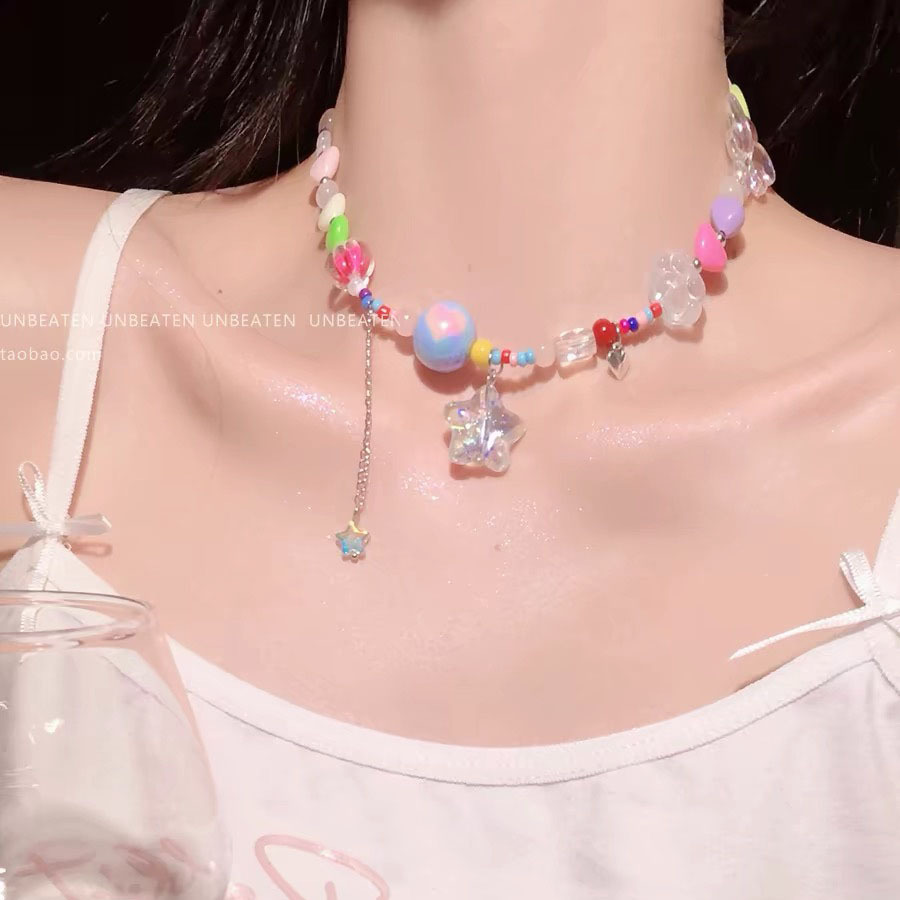 Sweet Cool Color Dopamine Necklace Women's Candy Color Star Long Tassel Stitching Clavicle Chain Girl's Cute Neck Chain