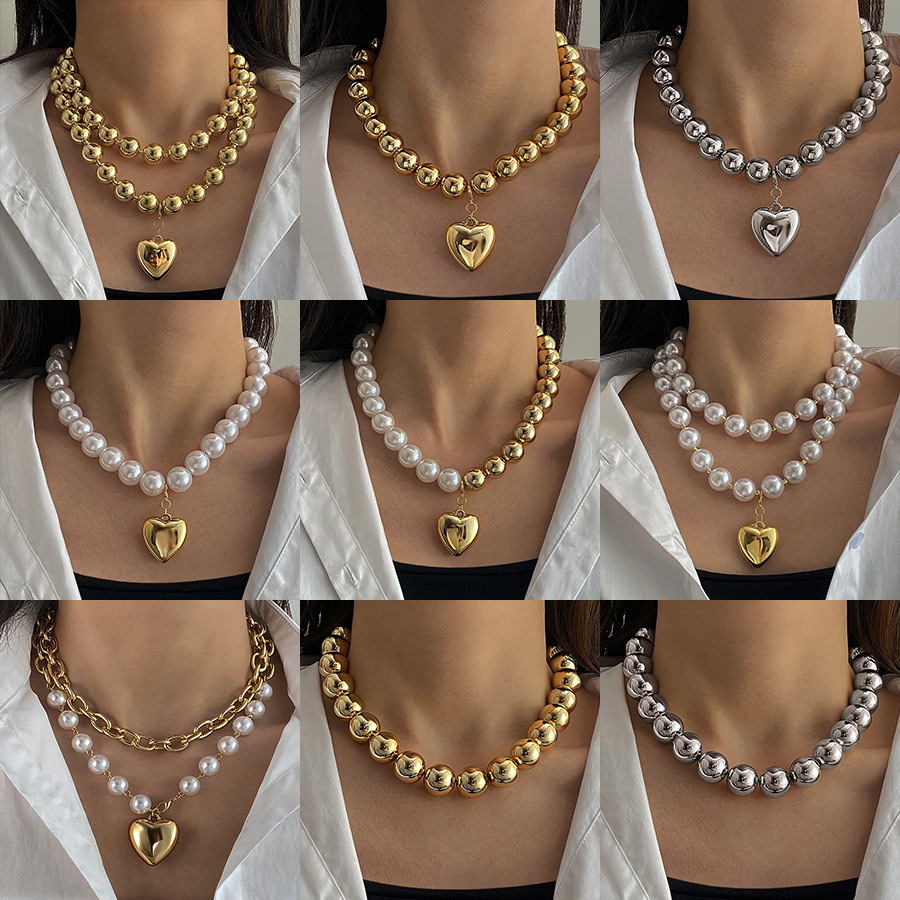 Cross-Border Popular Multi-Layered Heart Beaded Necklace Gold and Silver Pearl Clavicle Chain European and American Style Women's Accessories