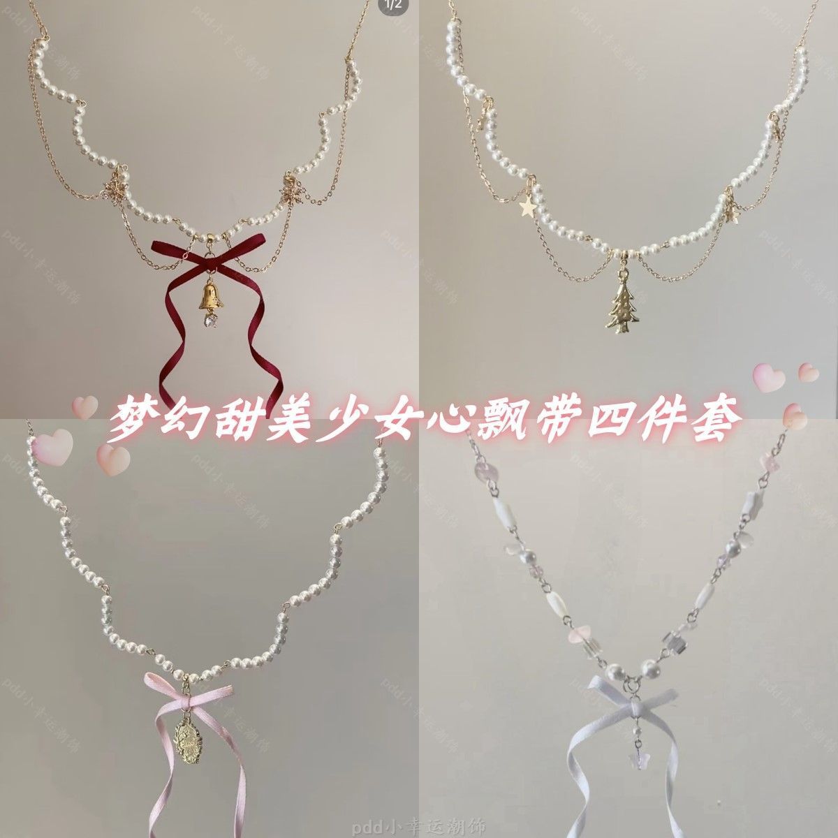 "Cream Berry" Bow Ribbon Bell Pearl Necklace Delicate Dreamy Sweet Girl Heart Clavicle Chain