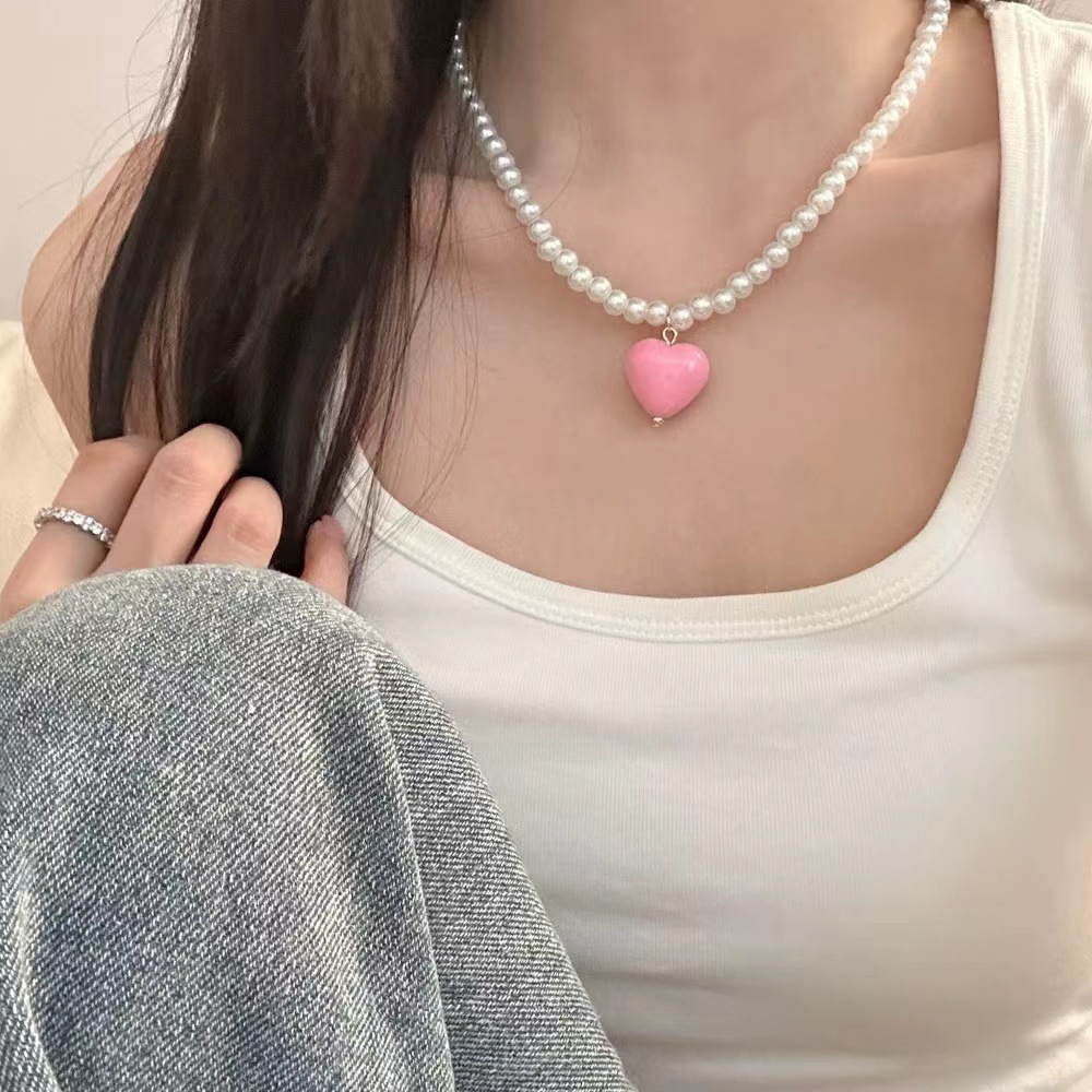 Ins Powder Love Pearl Necklace South Korea Niche Design Sweet Cute Girl Style Retro Stylish Clavicle Chain