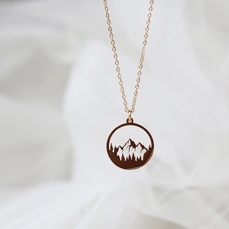 XL457 Snow Mountain Forest Hollow Beautiful Plateau Round Necklace Clavicle Chain Titanium Steel Plated 18K Gold Girl