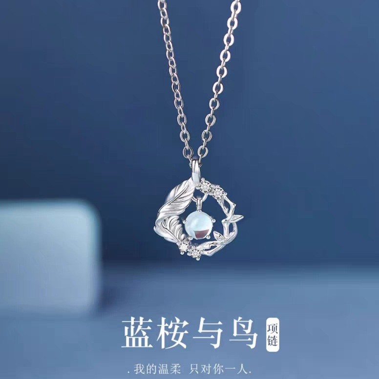 Silver-Plated Blue Eucalyptus and Bird Necklace for Girls 2025 New Hot Style Accessible Luxury Niche Chinese Valentine's Day Birthday Gift for Girlfriend Wholesale