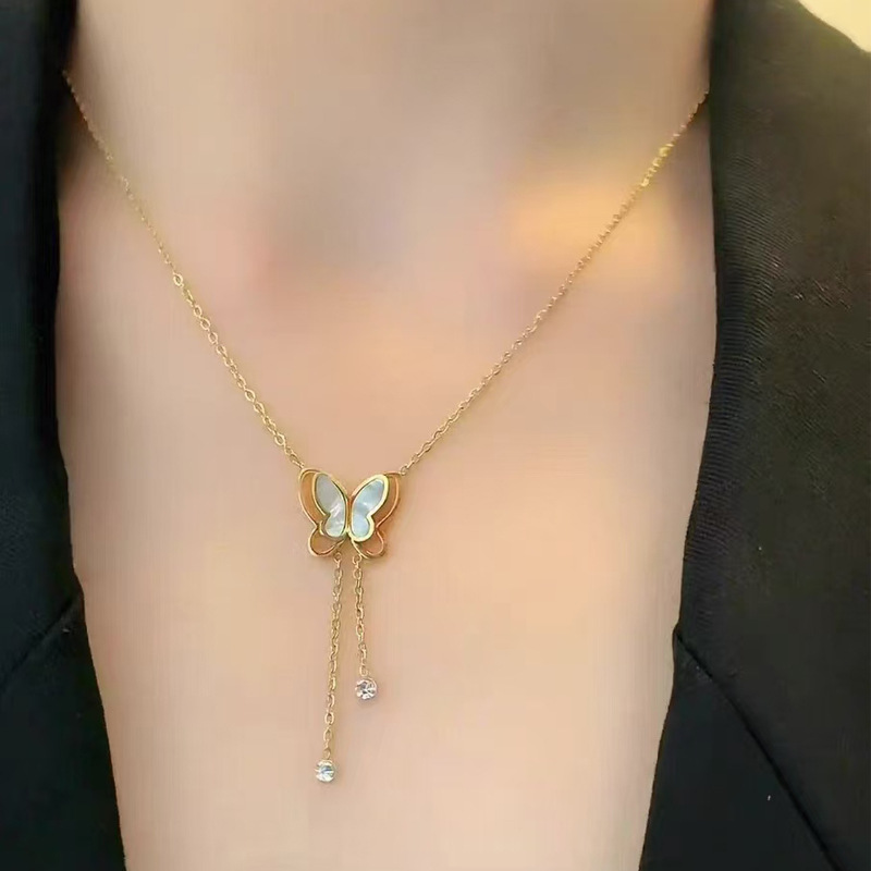 Fashion titanium steel female niche design all-match white shell double hollow with diamond tassel butterfly temperament trend clavicle chain