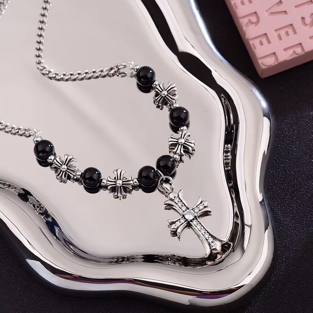 New Retro Black Beaded Cross Stitching Necklace Women's Niche Hip Hop Fashion High-end Sense Woolen Chain Accessories