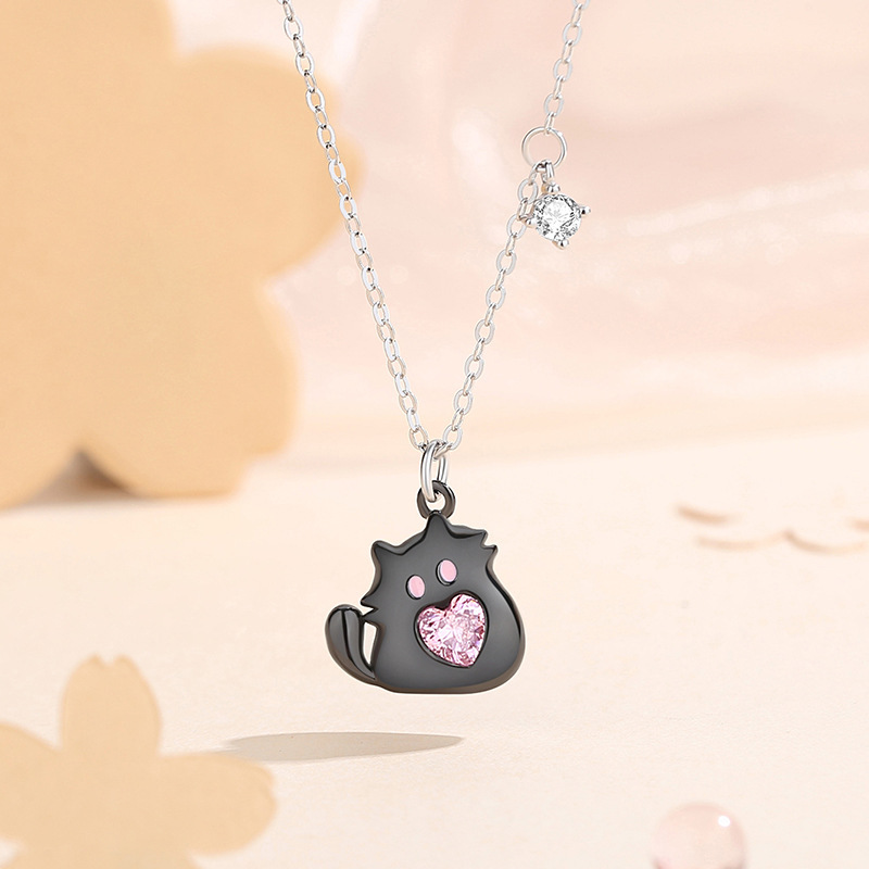 Pink ink kitten necklace suit women's dark pink diamond love pendant simple cute cartoon cat clavicle chain