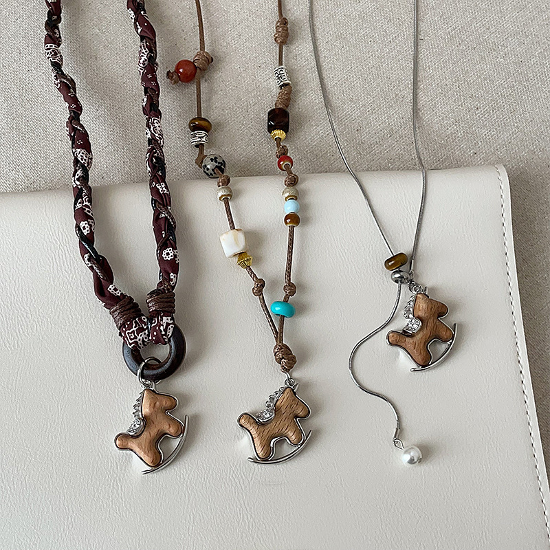Design-Inspired Wooden Carved Rocking Horse Pendant Necklace for Women, Vintage Light Luxury Trendy Fashion Versatile Choker Sweater Chain