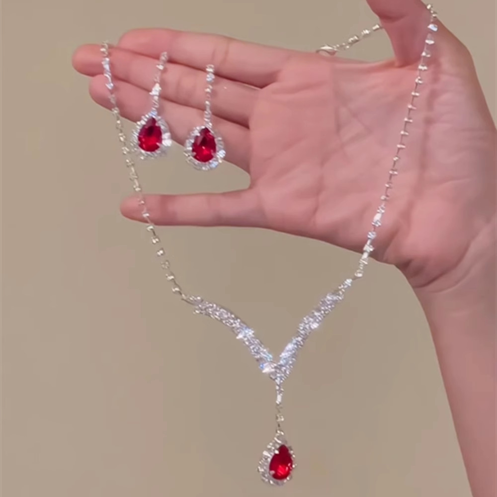 Red Water Drop Zircon Necklace Earrings Set Women's Evening Dress Accessories Clavicle Chain Necklace Fresh and Sweet Elegant