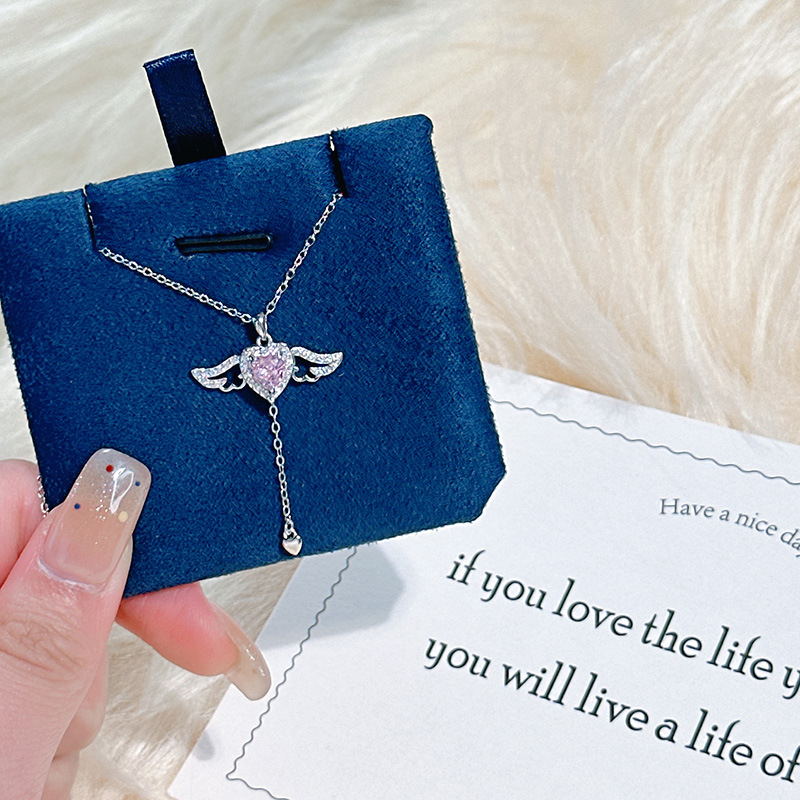 S999 Sterling Silver Heart Wings Pink Diamond Tassel Necklace for Women Sweet Versatile Pendant Niche Design Clavicle Chain Jewelry
