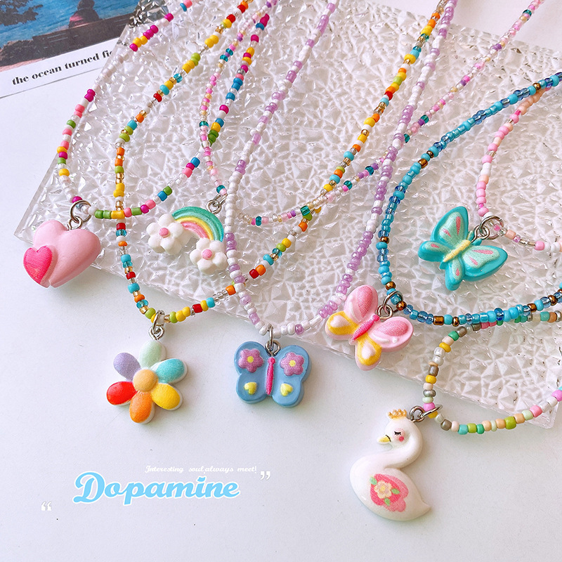 Japanese and Korean Color Beaded Necklace Childish Cartoon Cute Children Butterfly Love Clavicle Chain Dopamine Girl Jewelry