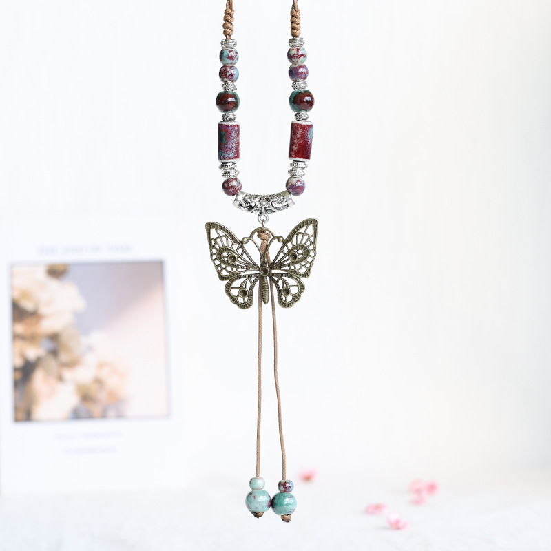 Factory supply wholesale national style ceramic necklace sweater chain women woven butterfly pendant pendant new Chinese accessories