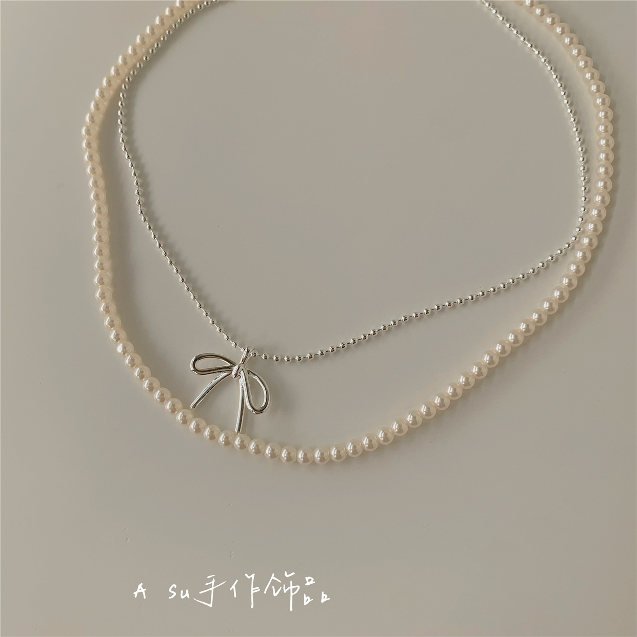 Sweet Elegant Double-layer Ball Chain Bow Pearl Clavicle Chain Necklace Women 2024 New All-match Girl