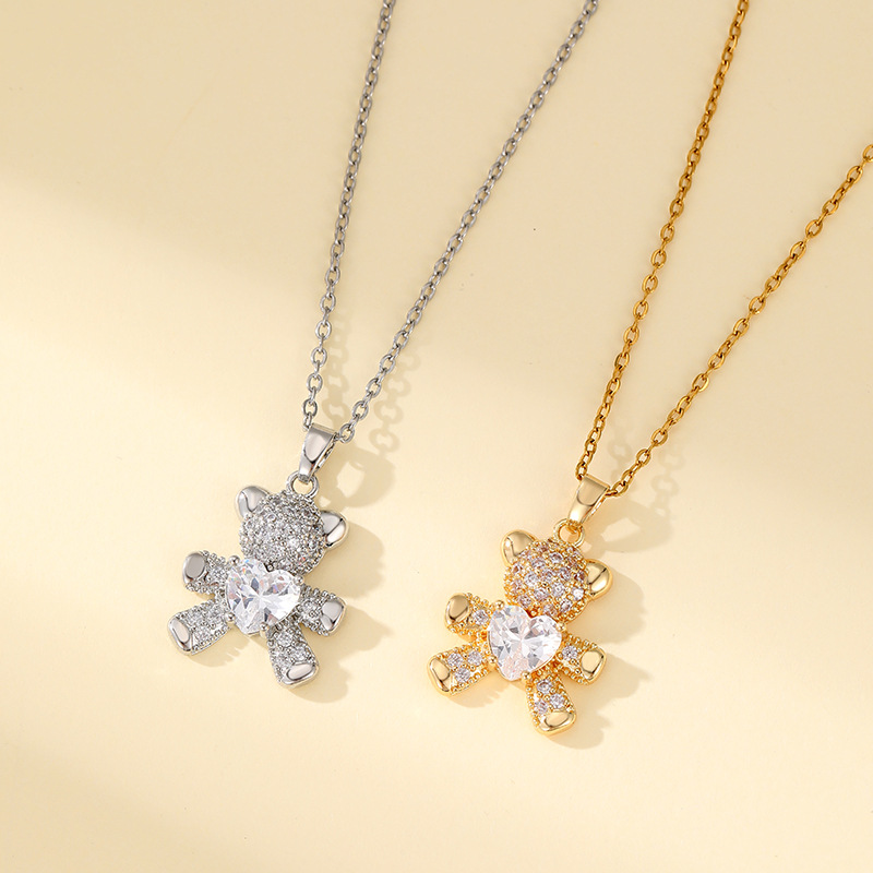 Titanium Steel Necklace for Women, Light Luxury, Cute Bear, Loving Bear, Micro-Paved Zircon, Niche Simple Clavicle Necklace
