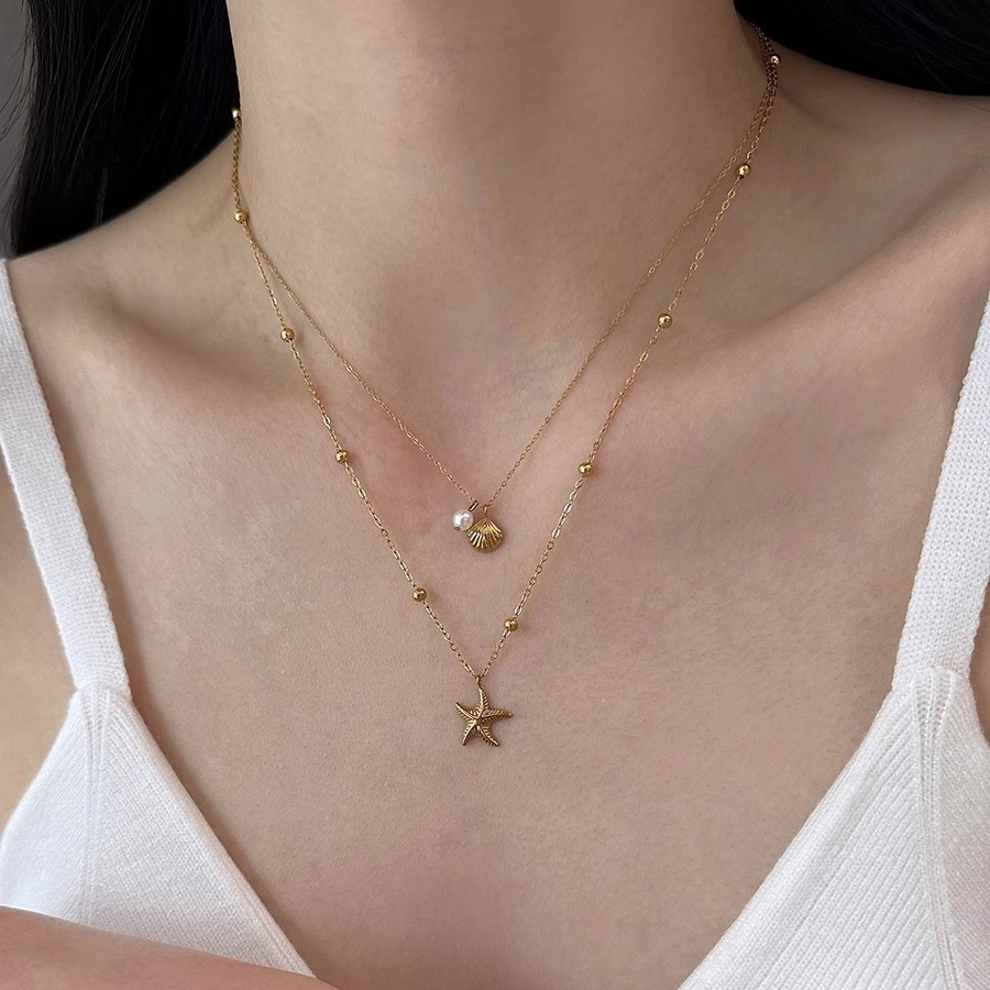 Double-layer Starfish Shell Sweet Stacked Necklace Women's Fashionable Holiday Style Sweet Necklace Titanium Steel Clavicle Chain High-grade Sense