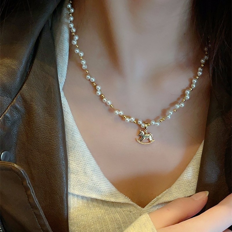 Retro Crushed Ice Trojan Horse Pendant Bubble Wrapped Pearl Necklace Women's Design Exquisite Fashion Clavicle Chain