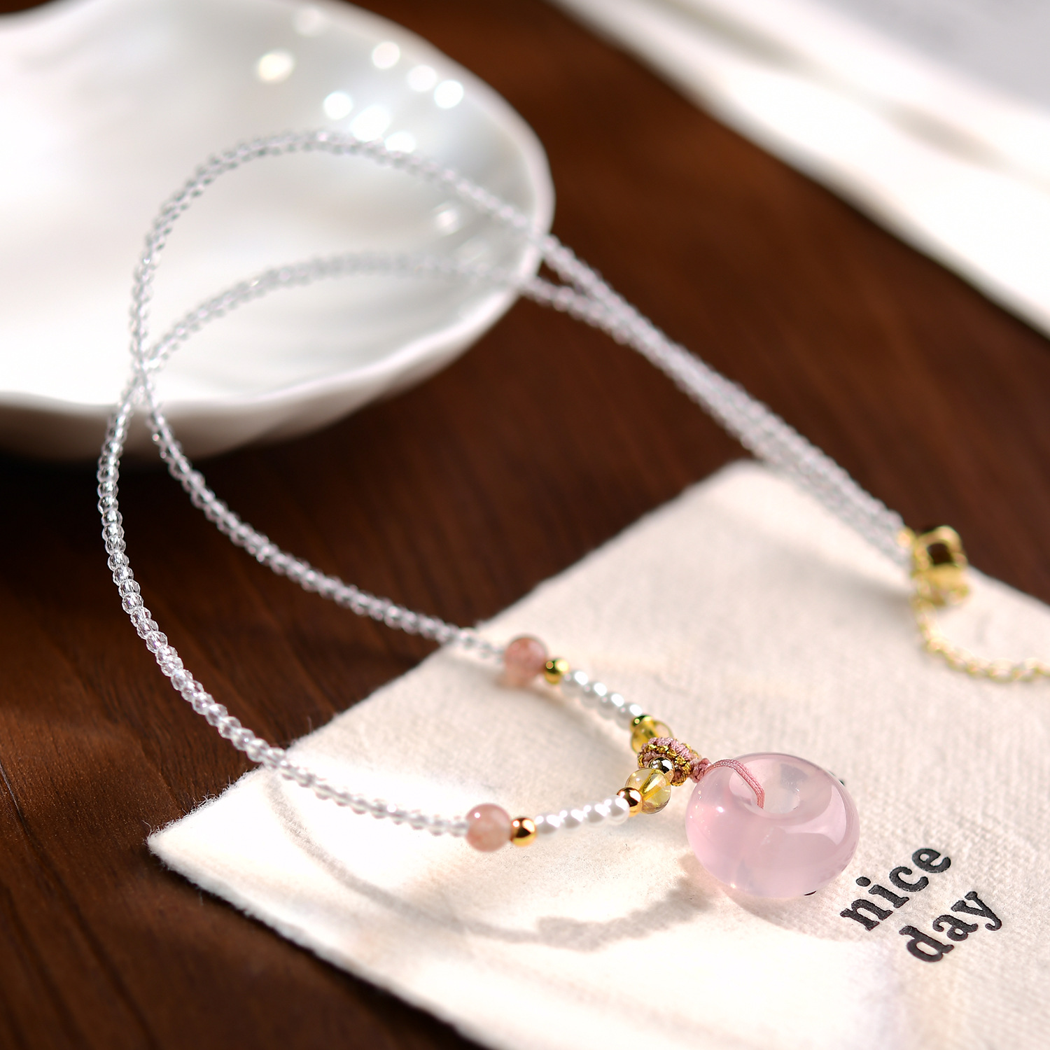 Pink Crystal Necklace, a Refreshing Summer Gift for Girls, Beaded Peace Buckle, New Chinese Style Pink Crystal Handmade Pendant