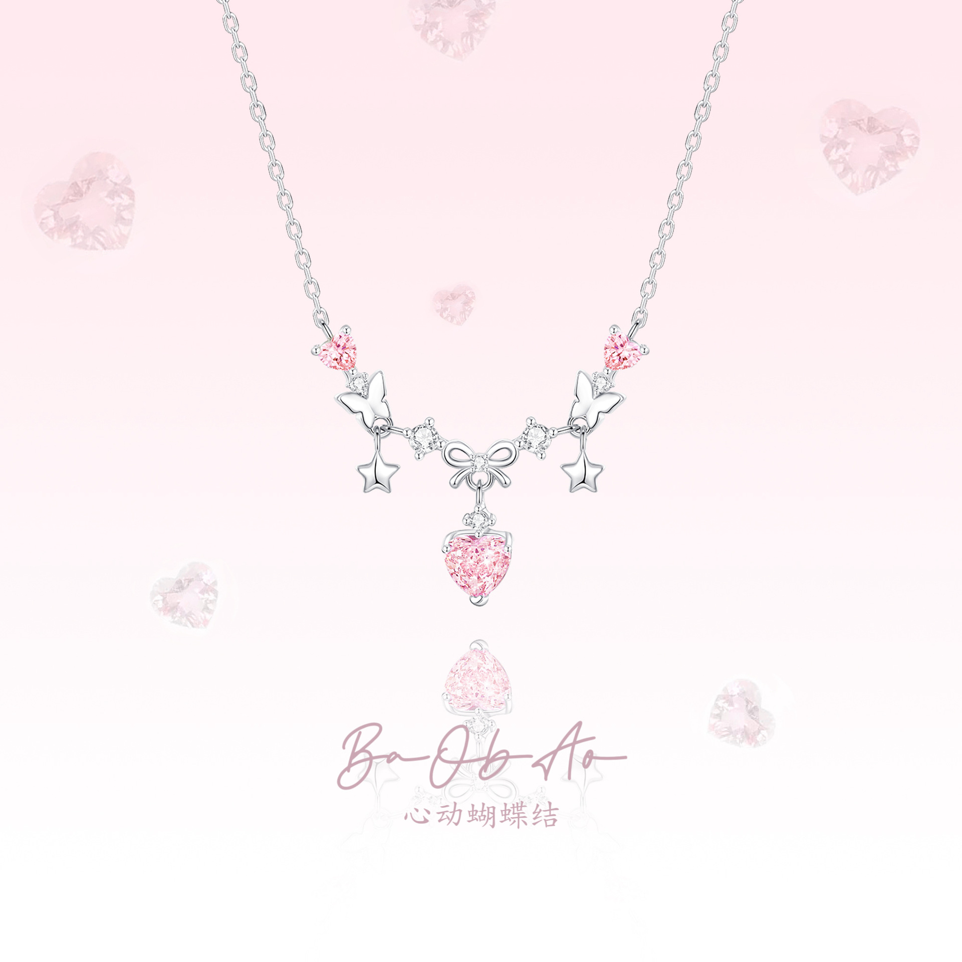 Baobao Original Niche Design Sterling Silver Ice Flower Cut Pink Diamond Bow Princess Tassel Necklace Sweet Clavicle Chain