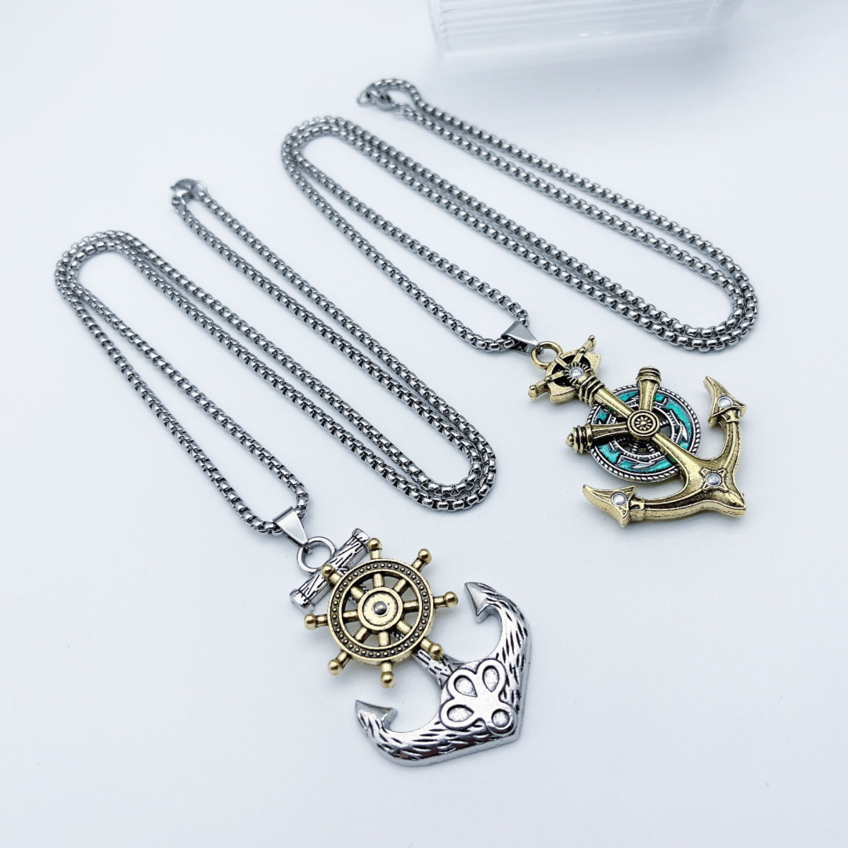 Sailing anchor necklace men's fashion European and American safety protection compass rudder Xizang silver pendant personality all-match rotatable