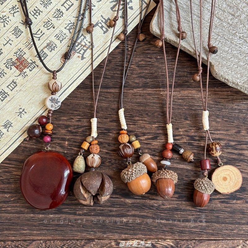 Wooden Front Tone ~ Zen Plant Acorn Necklace for Women, New Chinese Style Design Braided Clavicle Chain, Long Accessories for Men