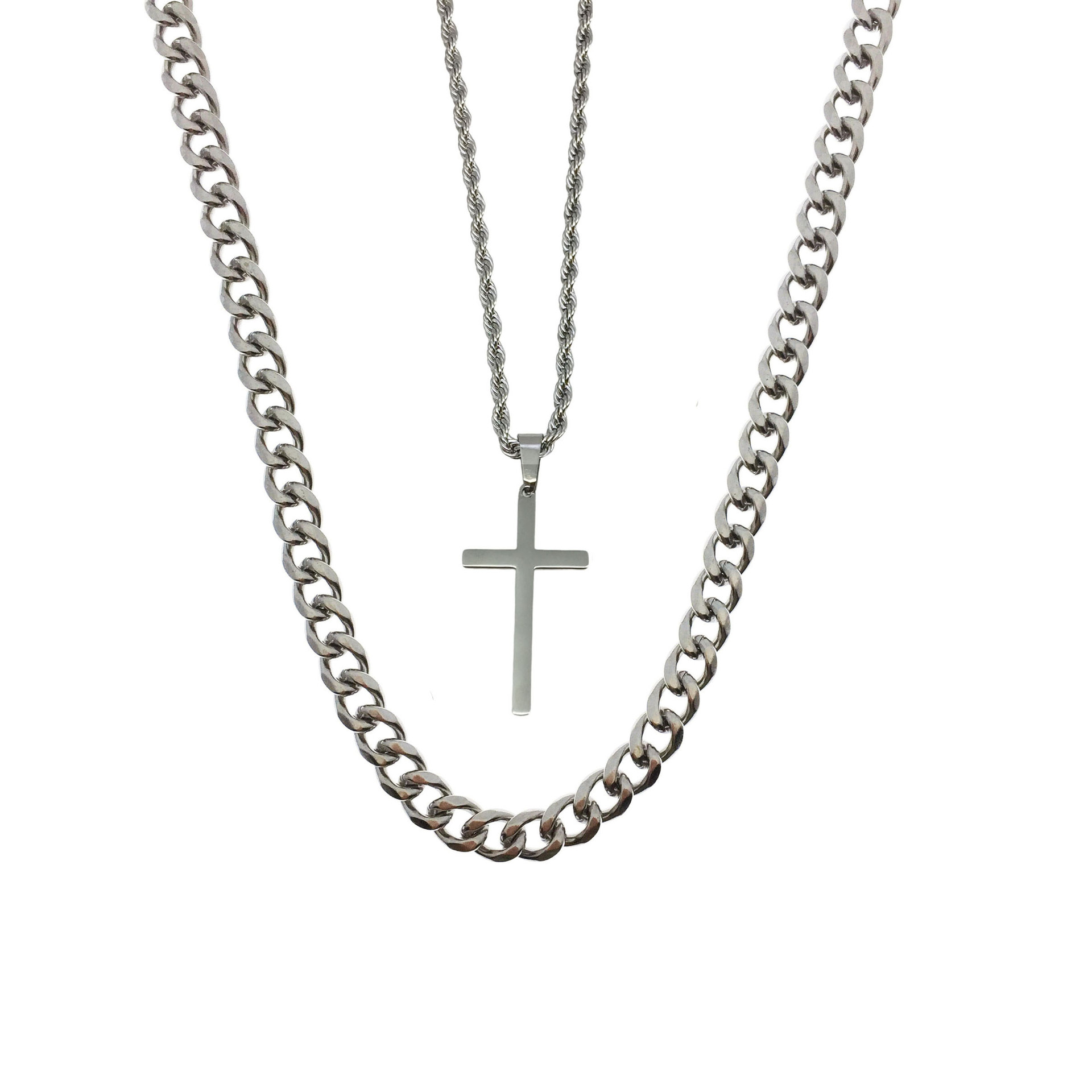 18K True Gold Men's Stainless Steel Cross Necklace Cuban Chain Black Silver Gold Layered Cross Pendant