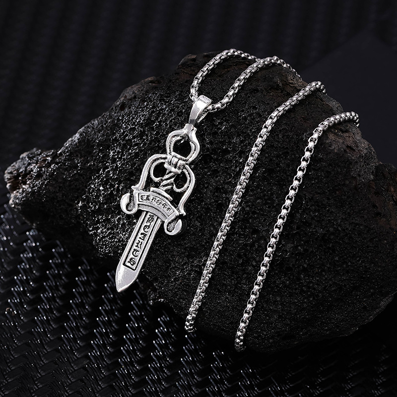 Retro Silver Crow Star Big Sword Pendant Men's Punk Easiest for Match Pearl Necklace Long Round Box Chain Women's Necklace