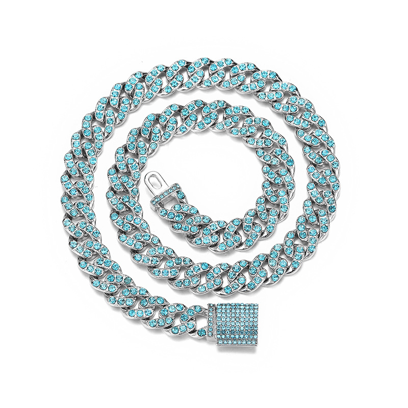 European and American Hot-Selling Hip-Hop Jewelry Men's Sea Blue Full Diamond Cuban Chain Necklace 11mm Fashion Box Buckle Necklace Jewelry
