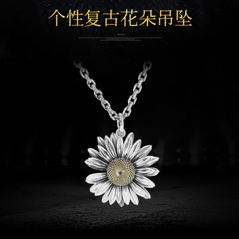 2022 New Summer Daisy Flower Pendant Necklace Men's Retro Personalized Thai Silver Necklace for Boyfriend