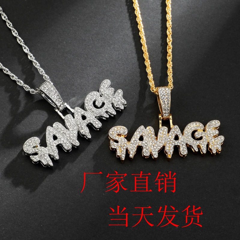 Wish Hot-Selling Personalized Street Rap Hip-Hop Savage Pendant with Sparkling Diamonds Trendy Necklace Geometric Shape