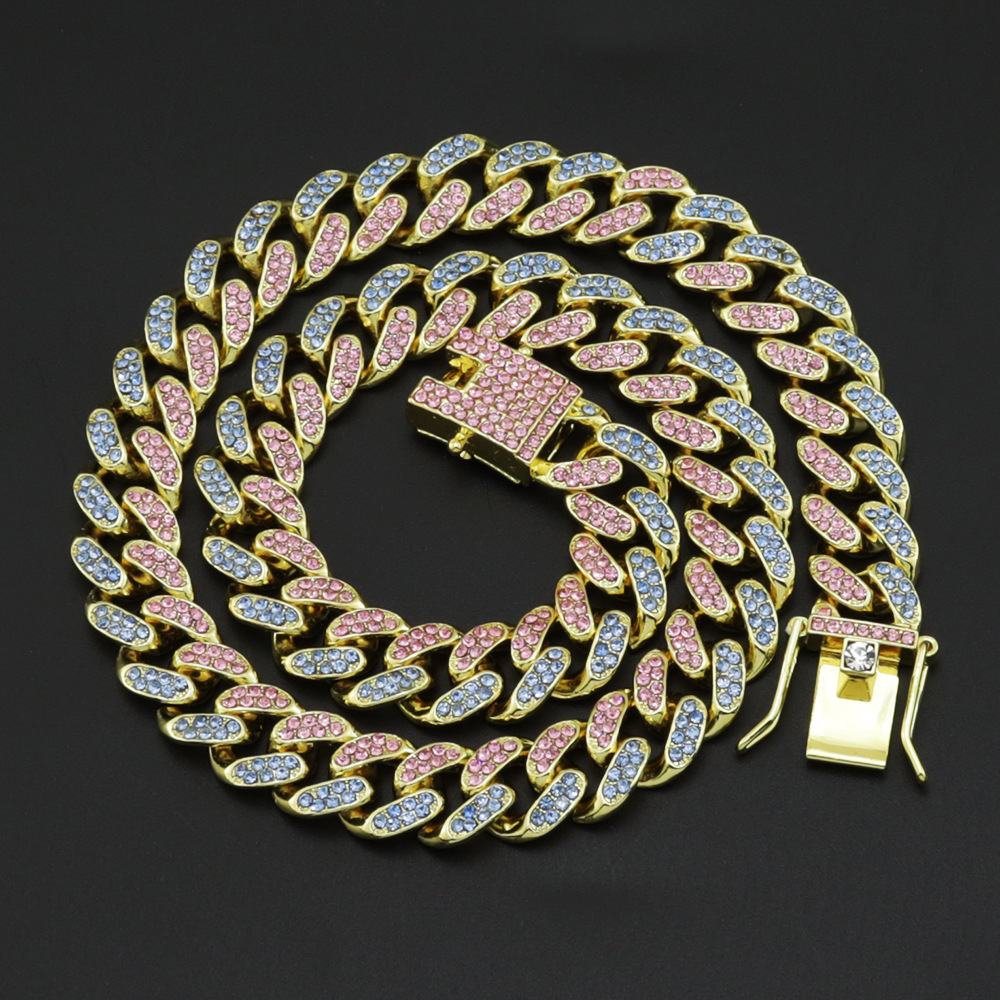 European and American men's hip hop inlaid colored diamond necklace hiphop Cuban chain exaggerated hip hop rap colored diamond alloy tide cross-border